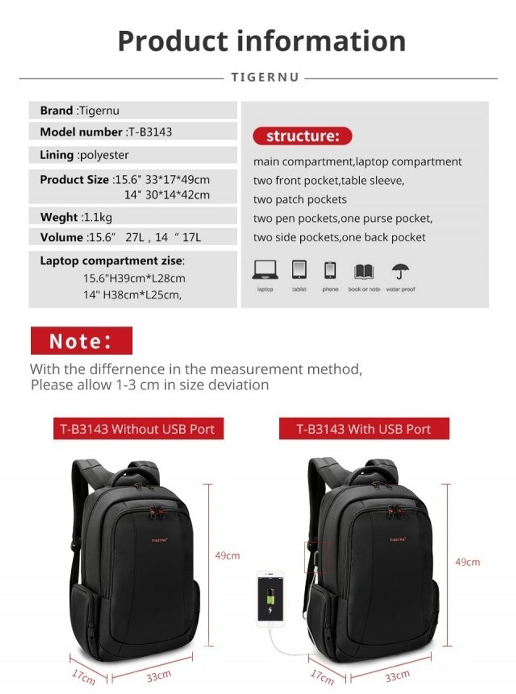 【TIGERNU】Notebook Backpack / Laptop Backpack T-B3143 15.6 inch Anti-Theft & Waterproof by Double Zip with USB Charger Port & PadLock